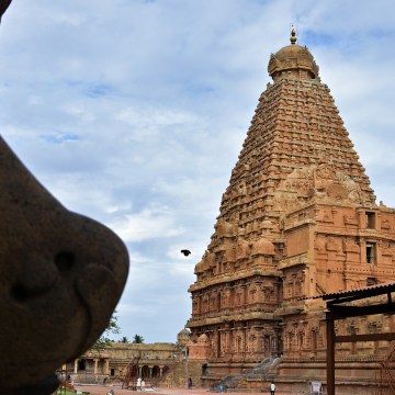 ‘DSC_0241 – Brihadeeswara viewed from thw angle of Chola period Nandi on the South side of circumambulatory.’