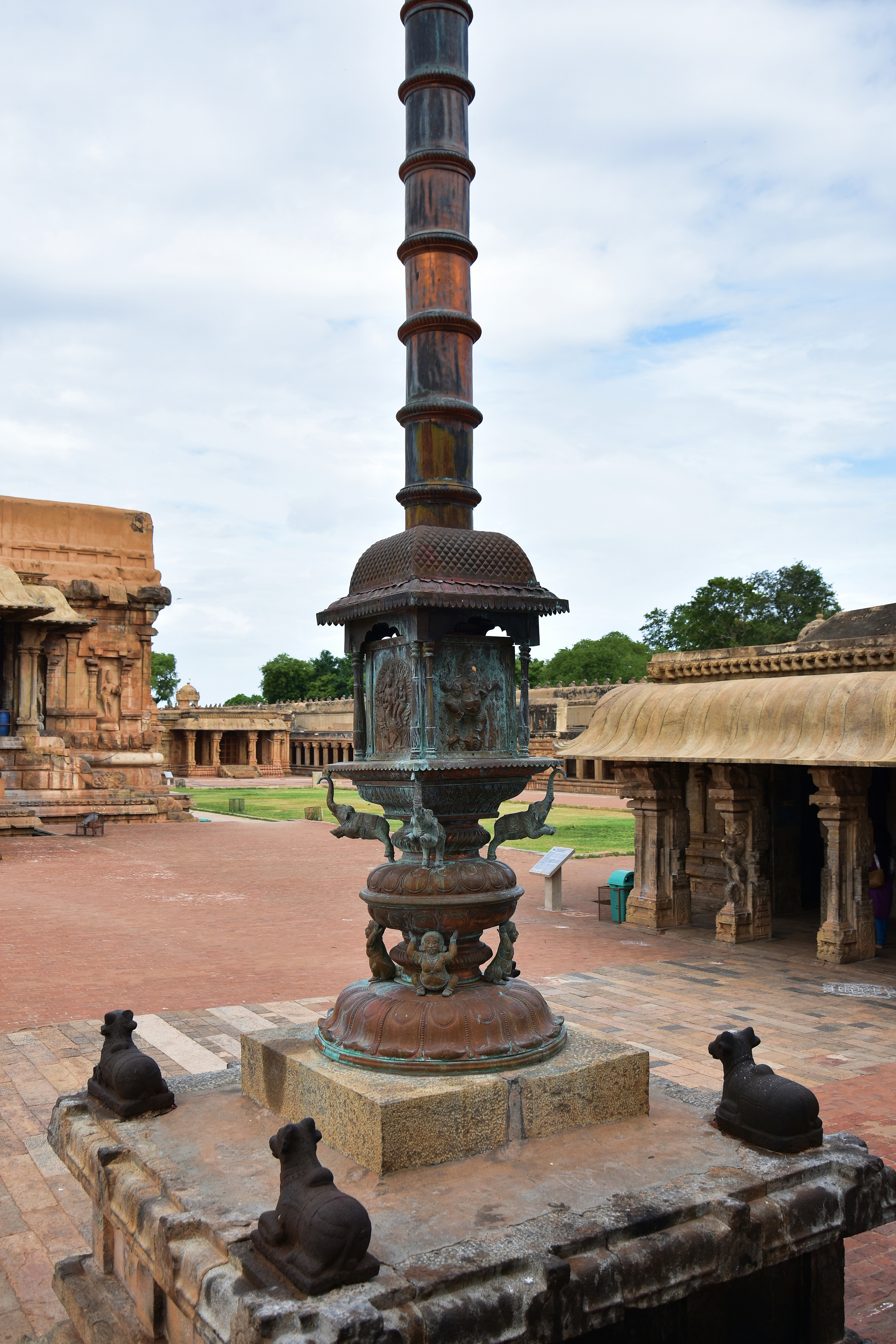 ‘DSC_0299 – Copper flag post from SE corner – E facing Ganesha and S facing Karthikeya with his consorts Valli,Devasena.’